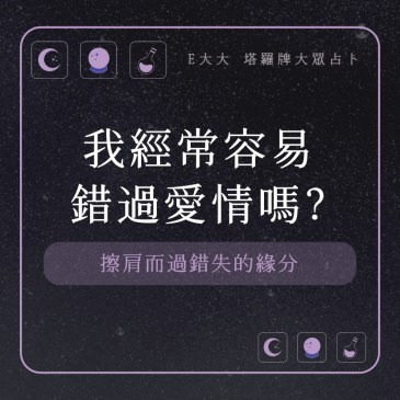 嗨~我是E大,歡迎你來到我的塔羅世界,創立這個平台主要是為了讓更多人對塔羅牌產生興趣,並且能透過牌卡找到自己人 … More 我經常容易錯過愛情嗎?擦肩而過錯失的緣分,測測看好了! |塔牌測驗💜