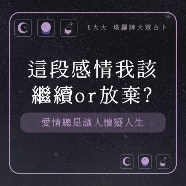 嗨~我是E大,歡迎你來到我的塔羅世界,創立這個平台主要是為了讓更多人對塔羅牌產生興趣,並且能透過牌卡找到自己人 … More 這段感情我該繼續or放棄?愛情總是讓人懷疑人生,測測看好了! |塔牌測驗💜
